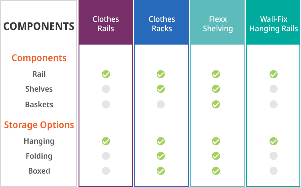 Flexx can offer the greatest variety of storage methods, as well as Clothes Racks, so if you're looking for hanging, folded and boxed storage, then explore these ranges. For hanging clothes, a 6ft Clothes Rail can store approx. 60-80 light clothes, or 30-40 heavy/bulky clothes.