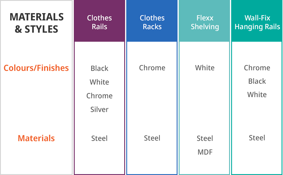 Clothes Rails and Hanging Rails components come in either Black, White, Chrome or Silver, while Pink is also available for Children's Clothes Rails. Clothes Racks come in Chrome, while Flexx components are available in White.