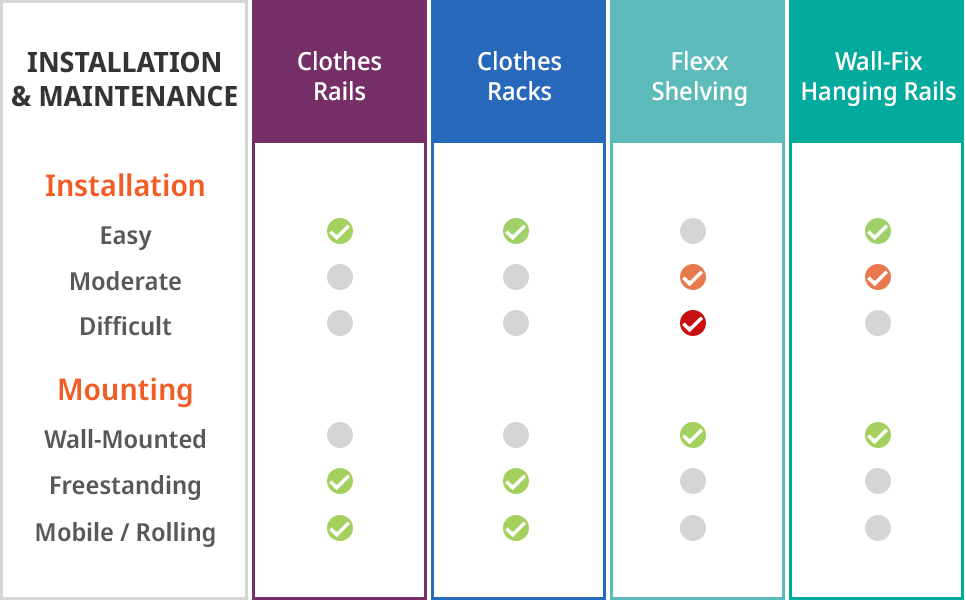 All clothing systems are relatively low maintenance. They can be wiped down and cleaned easily, without the use of harsh chemicals. You just need to make sure you regularly inspect components and accessories, and with Flexx and Wall-Fix Hanging Rails, ensure all fittings are still fully secured to the wall.