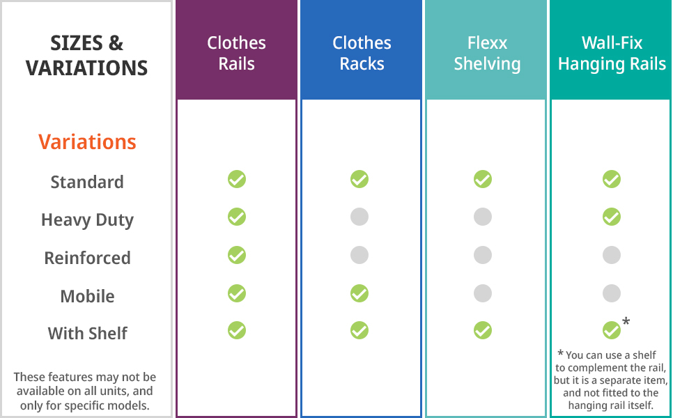 Each system offers different sizes to suit your requirements. The main dimension that varies for Clothes Rails and Hanging Rails is the width (or length). Some Clothes Rail units also offer a higher drop, suited for long garments. Clothes Rack height and width vary, while Flexx offers different dimensions for a range of its components.