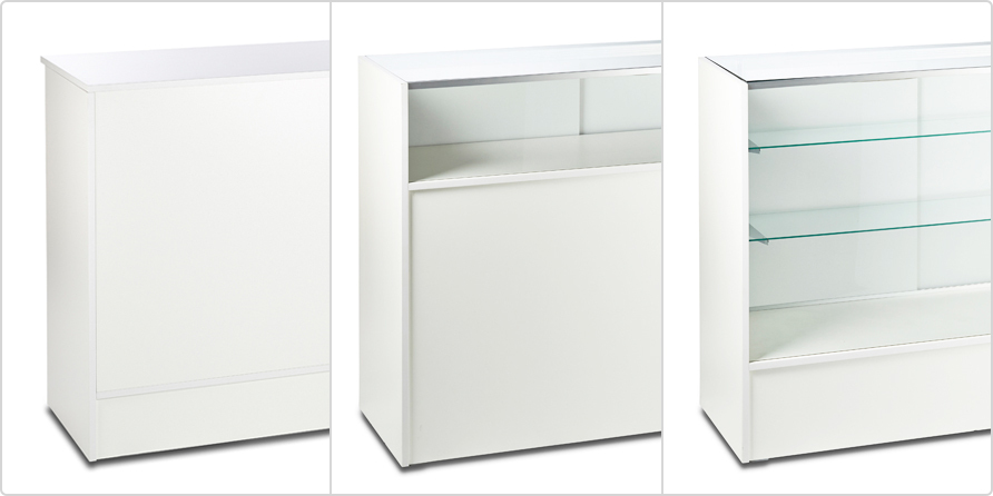 The most common have a solid front, maximising storage in the back for shop supplies and keeping items hidden. This storage can comprise of shelves, cupboards (which can be lockable) or a combination of the two.