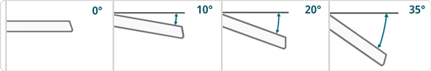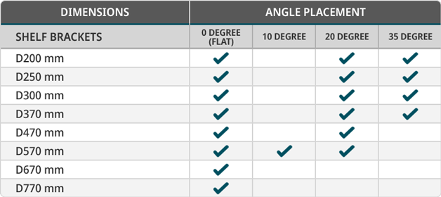 Specific shelf bracket sizes, can be placed at angles.