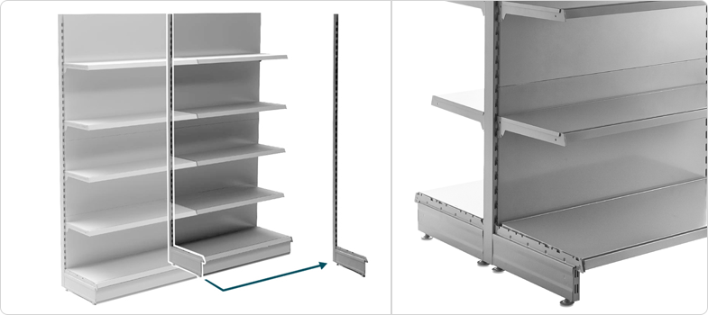 For gondolas, a unit requires a base leg and a back panel on each side, both of which attach to the upright as usual.