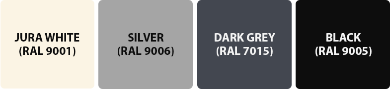 Jura White (RAL 9001), Silver (RAL 9006), Dark Grey (RAL 7015) and Black (RAL 9005).