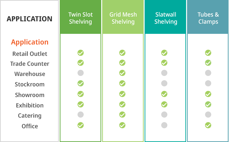Grid Mesh offers the greatest versatility, offering a range of accessories, used for both displays and storage. Like Slatwall, there are also freestanding units available. The other systems are more typically used for displays, with applications including, but not limited to, retailers, exhibitions or offices.
