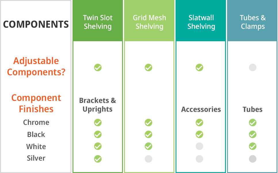 Twin Slot uprights and brackets are available in Chrome, Black, White or Silver. Grid Mesh main components and Tubes are available in Chrome, Black or White, and accessories for Slatwall, like brackets and arms, are available in predominantly Chrome.