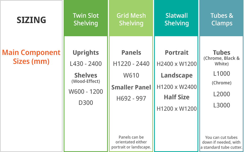 Components for each shelving type come in a range of sizes, making it easier when you're looking to fit in a specific place, plus, you can trim Slatwall panels and Tubes if needed. Grid Mesh and Slatwall can also be orientated portrait or landscape, giving you more options.