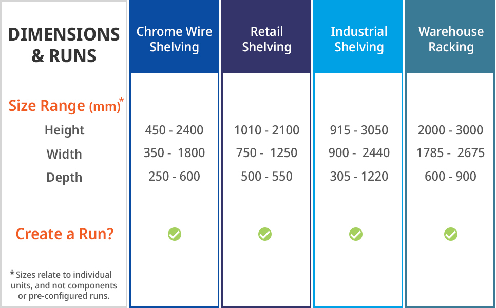 Each shelving type is available in a range of sizes. Chrome Wire Shelving typically offers a wider selection, including smaller heights and depths, though all ranges provide multiple dimensions.