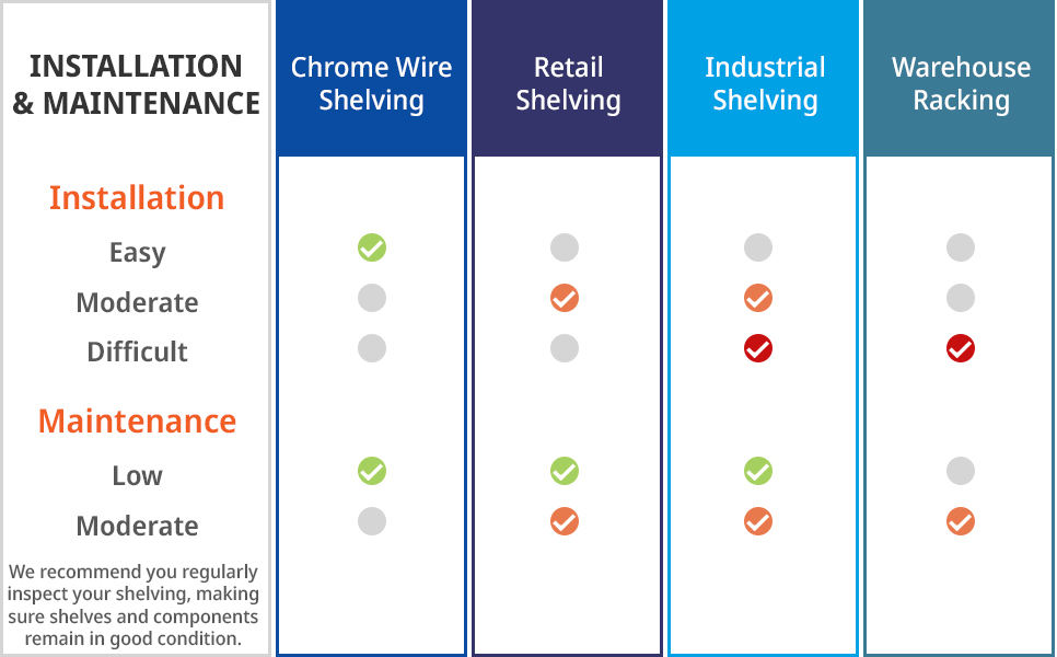 Chrome Wire Shelving is the most straightforward to assemble, requiring minimal tools. The other ranges are more complex and may need multiple people, but in turn, they are generally designed to support heavier loads and/or greater quantities.