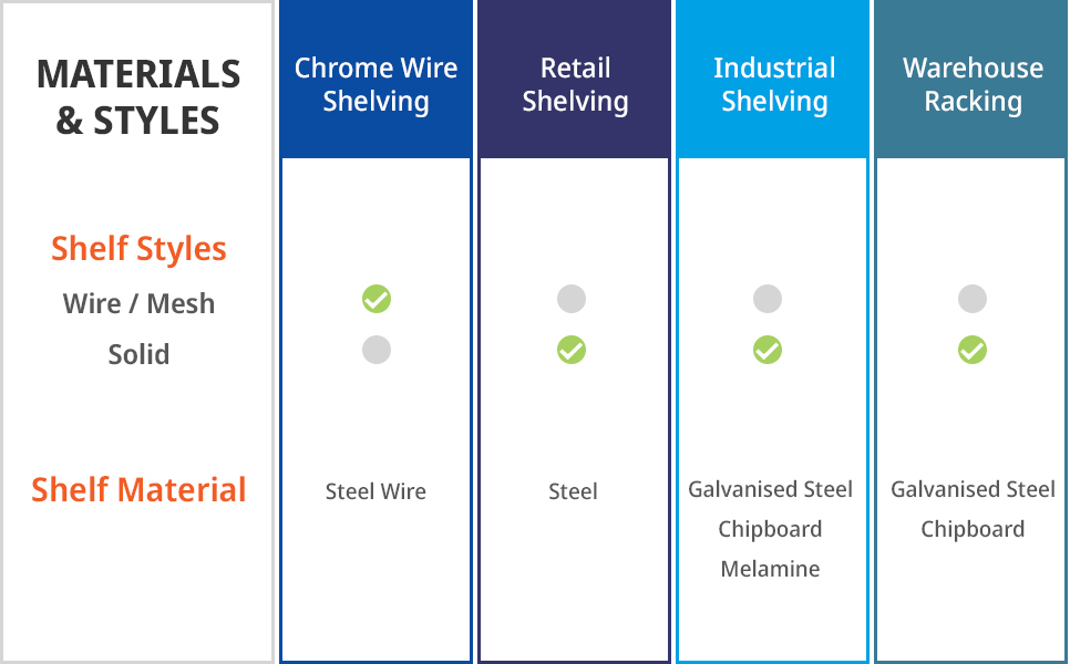 Shelf materials and styles vary by range: Chrome Wire Shelving has steel wire mesh shelves, Retail Shelving features solid steel shelves, available in different colours and with a variety of unit accessories, and Industrial Shelving offers strong, boltless units with galvanised steel or chipboard shelf options.