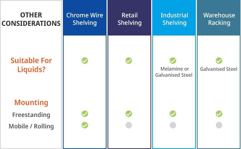 Retail Shelving and Industrial Shelving are freestanding, while Chrome Wire Shelving offers both freestanding and mobile options.