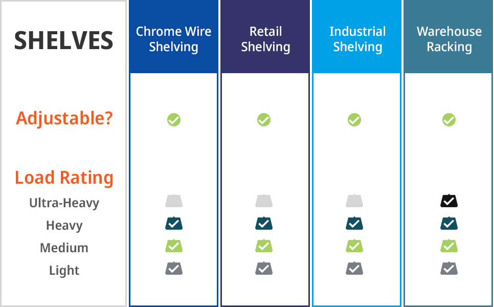 Each shelving type offers adjustable shelves with incremental positioning; however, Chrome Wire Shelving and Retail Shelving offer the benefit of easier adjustments.
