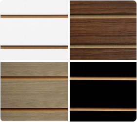 Our Slatwall Panels are offered in a variety of colours, with the most popular options including White, Walnut, Aurora Oak, and Black (see first image).